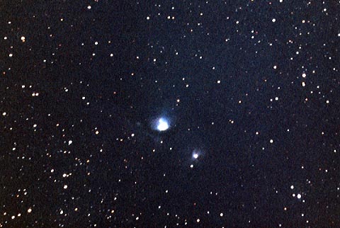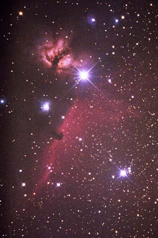 冬の南の空に、特徴的な鼓の形と3つ星を探せば簡単に見つけられる。 ギリシャ神話では、オリオンは海の神ポセイドンとアマゾンの女王の 妖精エウリュアレーの間に生まれた子で、 海の上を自由に歩く事ができる巨人だったといわれている。 オリオンは、月の女神アルテミスと仲が良かったが、 それを気に入らないアルテミスの兄アポロンが、アルテミスをだまし、 泳いでいるオリオンを、弓で射って殺させてしまったといわれている。 また別の説では、オリオンが「この世に自分より強いものはいない」 と自慢したため、怒った女神ヘラが大さそりに 刺し殺させたともいわれている。 さそりに刺し殺されて死んだオリオンは、今でも さそり座が上がってくると沈み、さそり座が沈むと上ってくる。 オリオン座には、2つの1等星ベテルギウスとリゲルがある。 ベテルギウスは、脇の下という意味で、その名の通りオリオンの 脇の下に位置し、おおいぬ座のシリウス、 こいぬ座のプロキオンとともに、 冬の大三角形を構成する。リゲルは巨人の足という意味。 M42オリオン大星雲や、馬頭星雲と呼ばれる馬の顔の形をした暗黒星雲、 バーナードループ、ウルトラの星として知られているM78星雲など、 有名な天体も多い。 |