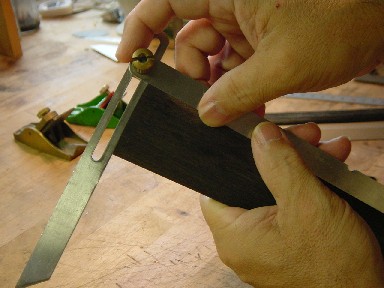 指板の上面を削って厚みを出します。 仕上がり寸法は、上が7〜7.5mmしたが11.5〜12mmです まず指板の横に5mm強から5.5mm弱の線をケガキます。 この寸法は指板の仕上がりの厚みによって多少変化します。 厚めの仕上がりを好む場合は、多少多目にするといったようにある程度の誤差は許されると思います。 |