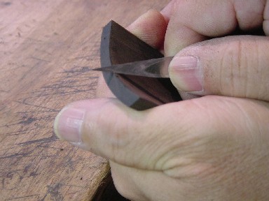 中央部が1mm強、隙間があくように削ります。 演奏上非常に重要な部分ですので出来る限り精確に削ってください。 |