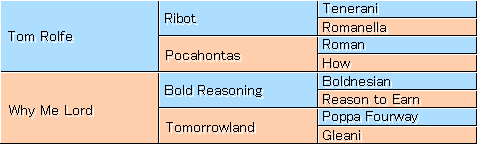 2歳・秋 0- 1- 1- 9/11 0.0% 9.1% 2歳・秋 1- 0- 0- 5/ 6 16.7% 16.7%