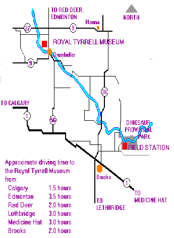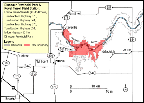 ![]() ![]() location of Dinosaur Provincial Park in relation to the Royal Tyrrell Museum |