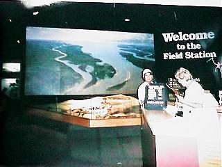 ”ダイナソ−州立公園”フィ−ルドステ −ション内の展示風景This displayis made up of fossils excavated from one of the manyCentrosaurus bone beds in Dinosaur Provincial Park. The remains of these large ceratopsian dinosaurs are preserved in vast assemblages of disarticulated bones of centrosaurs which appear to have drowned in a massive flooding event. How many different bones can you identify? If you would like to join one of our field crews working in one of these bone beds this summer check out our Field Experience '97. |