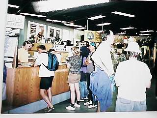 バンフ・インフォ−メ−ション・センタ−内部の様子たくさんの相談をする客が、押しかけていた.観光アドバイスする職員は、5−6名ほどいて、いずれも行列ができていた.ここには、御土産物の販売コ−ナ−もあり、地図、登山道具等実用的な商品も販売されていた. |