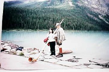 レイク・ルイ−ズ湖畔の名物おじさん記念撮影に収まっては、チップを貰っていた.もっぱら、日本人が後が途絶えないほど」次から次えと! 湖の水温は冷たく、ビクトリア氷河のとけた水が流れ込んで、湖を形成していた. ホテル従業員の服装も、このような一見、アルプスを連想させるいでたちであった. ホルンの演奏は聞けなかった.....記念撮影に忙しい? |