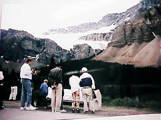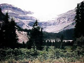 クロウフット氷河展望台さらに、20Kmも走ったであろうか....氷河をたたえた、ひときわ高い山が見えてきた. クロウフット氷河のようである. クロウフットとは、カラスの足跡という意味、氷河の形状から この名前がつく. Crowfoot Glacier(34 km from Lake Louise) A beautiful pale-blue glaciervisible from the highway, it was named a century ago when three toes of ice clung to the cliff. Today there are only two. |
