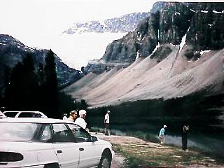 ボウ・レイク展望台ボウ氷原、ワプタ氷原の左に見ながら、10Kmほど走ると、湖が見え始めた.ボウ・レイクである. ボウ氷原の氷が解けてできた、バンフ国立公園内で3番目に大きい氷河湖!! 壮大な景観!!!! ボウ・レイクは、ボウ川の源 |