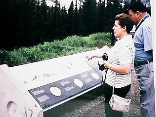 ボウ・レイク展望台で説明板に見入る観光客 |
