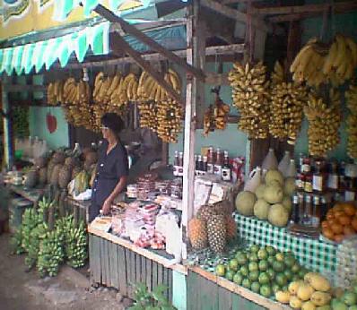 火山の観光の後,一般国道を車で走って帰宅の途についた。国道のそばにはたくさんな露天商が並んでいて、地元でとれた果物とか地元で作ったかし、食料品などさまざまなものが販売されていた。おみやげものに買って帰ろうということになって道筋に並んでいる露天商に車をとめて、ショッピングを楽しむことにした。車を止めてわれわれが車から降りていくと、すぐに露天商の販売している人々が寄ってきて、買えと盛んにいろいろ品物を持ってきて進める。商売が熱心である。写真に乗っているのは現地の果物を販売している露天商である。屋台は街のいたるところでよく見受けられた。日本で非常になじみがあるフィリピン特産のバナナをはじめとして、パイナップル、マンダリン・マンゴー等トロピカルフルーツが・・・・・・・・・ |