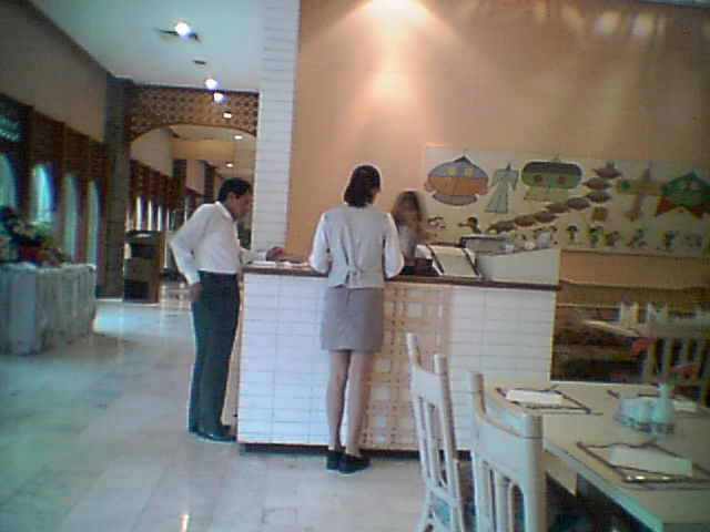 1,999年十月十八フィリピン村のテーマパークのそばにあるホテルのレストランで昼食フィリピンの国際空港のそばにあるテーマパーク"フィリピン村”を見学することにした。ちょうど時間もお昼を回っていたので、このフィリピン村のテーマパークのそばにあるホテルのレストランで昼食をとることにした。運転手が案内してくれたホテルである。ホテルの外観は非常に大きな建物であったが中に入ると3星のクラスと思われるような感じ・・・ ホテルのレストランで昼食ビデオ ビデオは Internet Explorer で見れます。 また、Microsoft Windows Media Player が必要です。(入手方法) レストランに入っていくとお客さんは誰もいなくて、昼食ができるかと尋ねるとできるということなのでメニューを持ってきてもらった。われわれが泊まっているホテルに比べると格段にホテルの質が違う。簡単な食事を注文することにした。やはりフィリピンでは宿泊するとなると5星ホテルのクラスに泊まるべきだとつくづく思った。このホテルのレストランの衛生状態、従業員のサービスの様子などを見ているとかなり質の低下が著しい感じであった。 このホテルで出された水はとても呑む気にはなれなかった。それで飲み物としてはコーラをを特別に頼むことにした |