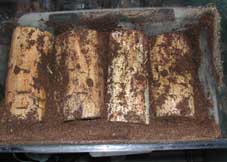 材は、柔らかいクヌギ、ナラの皮をきれいに取ります。出来ればネパールコクワで書いてた材を煮こんで表面を柔らかくしたほうがいいです。材をより好みしますので沢山入れたほうがいいです。材は、全埋めにせず半分位出した方ががいいみたいです