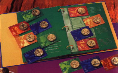 スポーツコインシリーズ銅貨は28種の競技をデザインした5$銅貨です。記念 アルバムには各種競技の内容と記録保持者の名前が説明されています。 |