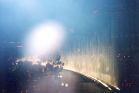 ベラージオホテルの噴水ショー夜になるとホテル前の湖から噴水ショーを行う これがまた素晴らしく、イルミネーション、音楽とあいまって 夜空に噴水が舞い上がる、何とも言えない 幻想的な世界を演出している! |