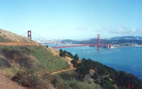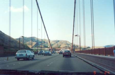サンフランシスコのゴールデンブッリジ-Vista Point-これも橋の上を走って初めて気がついたことであるが橋の上の車線は4車線で 片方2車線でそれに端の両そでに歩道をがついている http://park.coconet.ne.jp/sanfran/ggbbs1.html | |