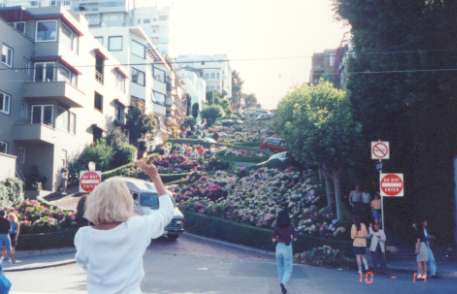 ロンバードストーリートLombard Street美しい花に彩られた坂道をハンドルを切りながら降りていく 道の両側に並ぶ美しい花壇が素晴らしい 花で坂道がうまってているといっていい美しい坂道である! 8つのヘヤーピンカーブを車が歩く速度よりも遅く ゆっくりと降りてくる! サンフランシスコ名物の坂道 |