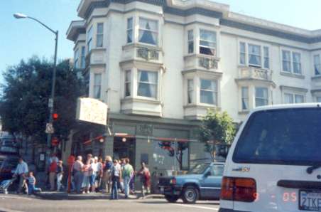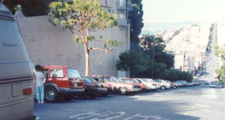 ヒルバートストリートサンフランシスコでもっとも急な坂道のストリートである ずっと坂道を降りって さらにその向こう、はるか向こうに道が陥っていくところに かすかに灯台が見える サンフランシスコに市電が通り出すと しだいしだいに坂の上の方に高級住宅街ができるようになった。 | |