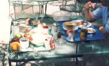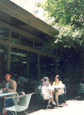 リスがテーブルで昼食をとり始めた! われわれもにヨセミテ・ロッジでレストランに入り昼食をとることにした!中に入って驚いたことにたくさんな人でごった返していた 行列を作りながら簡単なは昼食メニューを注文した。 せっかくだから外の景色を見ながら昼食をとろうということになり、 レストランの縁側の外に出て テーブルで昼食をとり始めた! 私たちがテーブルの上に昼食を並べて食事を始めると! 早速どこからともなくリスが近づいてきた! 警戒する様子もなく 非常に人なつこい! だんだん近づいてくる テーブルの上まで上がってきて、 早速おわれわれの食事をちゃっかりと食べ始めた! これにはいささか驚いた! |