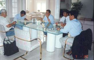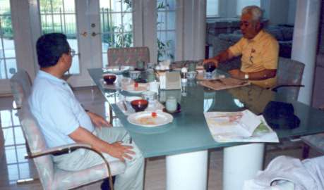 7月8日日本料理の朝食をよほど疲れていたのだろう、また、ベット心地も非常によかったせいもある 十分に熟睡をして、目が覚めたら朝の8時を回っていた! 階段を降りていき下のフロアーに行くと、 すでに、富永社長の奥様が日本の朝食を用意してくれていた! 玉井常務と富永社長が、すでに朝食を食べていた! カリフォルニア米のご飯、みそ汁、漬物、ノリ等々も本当に純粋な日本食の家庭料理を用意してくれていた! 玉井常温は非常にご満悦で、おいしい!おいしい!と連発して朝食を食べていた。 この日本食の朝食の接待には私たちも大変驚いてしまった! まさかアメリカでこのような純粋な日本食の家庭料理を食べられると思いもしなかった! 冨永社長は、日本食が好みの人らしい! 玉井常務と富永社長は朝の6時ごろ起きていて、早速、庭先のゴルフコースに出てはワンプレーをしてきたようである! そのプレーの様子を朝食を食べながら楽しそうに2人で話をしていた! |