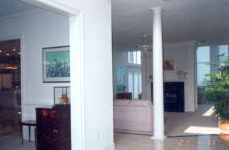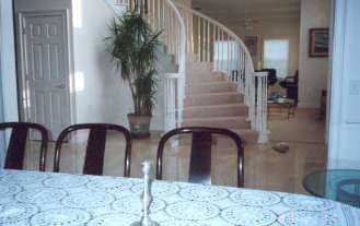 早朝の富永社長のゲストハウス前この写真のように、富永社長のゲストハウスの前はグリーン芝生がゴルフ場に続いている部分と、車が走るアスファルト舗装された通路の部分に分かれて、 写真遠方に見えるのは隣のゲストハウスである。 写真の左側壁にこの施設を取り囲む木立が見えている。 車でひと通り、この中を走ってみたが、フルコースのゴルフコースが完備されている施設だけあって、とてつもなく広いものであった。 池もあり、小山もあり 日本では本当に考えられない生活スタイルである! 生活のライフスタイルで、アメリカと日本ではまだかなりな差があるのが実態であると実感した。 経済大国日本などといわれているがアメリカ人が経験しているこの様な生活スタイルは、日本では50年たっても到底無理だろうと思った。 世界一の物価高を誇る日本では構造的な変革を行わない限り、このようなライフスタイルは到底思いもよらないいいものである。 この夢のようなライフスタイルの居住空間も、アメリカでは比較的安く手に入るため、このような居住環境が一般のアメリカ国民にも普及しているわけで、富永社長が購入したゲストハウスの値段が100,000,000円から200,000,000円といわれていたが、もし日本でこのような規模の施設を購入しようとすれば、その10倍や20倍は軽く超すような値段になるだろう! いやそれだけ出しても手に入らないかもしれない! すなわち、アメリカ人は生活をゆったりと、楽しみながら生きている姿がよくわかった。 富永社長のゲストハウス 一階フロアー |