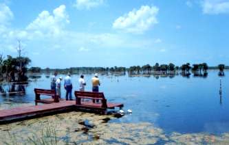 シルバースプリングス ” デューク・クリテンデン ”社長の案内冨永社長からシルバースプリングスのデューク・クリテンデン社長に事前に連絡していたみたいで、インディアン・リバ−果樹園にはシルバースプリングス社長が迎えに来てくれていた。 簡単なあいさつの後、 私が案内しましょうといって、車で果樹園を案内してくれた。 日本では想像できないほどの広さの果樹園面積であった。 かんがい水には、あらかじめ大きな池を作っておいてそこの水を引いてきてかんがい水として使用しているとのことであった。 数年前に寒波が来たことがあるという説明があったので、 気になり、寒波が来た時の防止策ははどのような手立てを講じたかを聞いた。 なにしろ、広大な果樹園面積では人力で寒波の防止をするといったってできるような広さの面積ではない。 そうすると、社長はかんがい水ようの池の水をこの果樹園全面に引いてきて果樹園を水浸しにすることによって、寒波の防止対策を行ったということであった! なるほど、アメリカらしい非常にスケールの大きいやり方である! 寒波の際水を溜める窪地 |