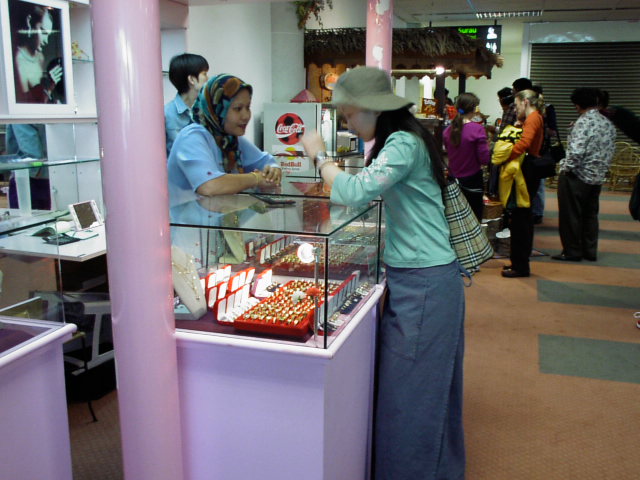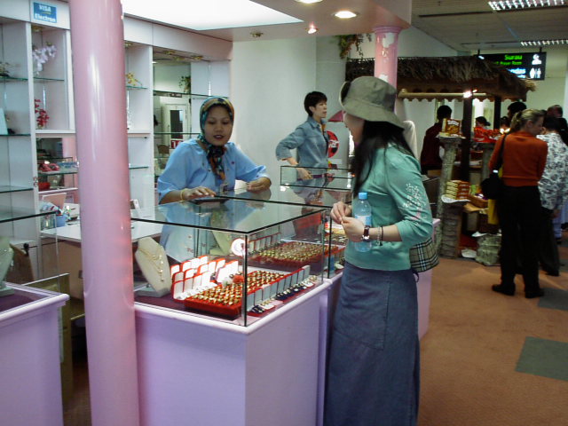 空港内のターミナルには、簡単な売店が数件営業法していた品物の数は決して多くはなかったが、富野さんは盛んにショッピングに余念がなかった。宝石や、民芸品、そして場所、履物や、衣服類などさまざまな品物が展示販売されていた。 値段的には決してそんなに安いものではなかったが店初めてマレーシアの国にやってきたという富野さんには非常に珍しくショッピングを意欲をそそるものらしかったようである。 販売している売り子さんには中国人系の人やマレーシア人など多民族国家にふさわしい人種構成を示していた。 マレーシア人系の人はとくに女性をは頭にスカーフをかぶり独特のコスチュームをしていたのですぐわかった。 |