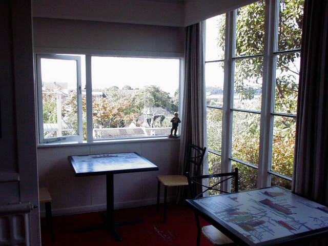 食堂の窓からは住宅街の屋根越しにオークランドの港が遠望できた。非常に緑の豊かな住宅街て、これが海岸部の方に向かって坂になって続いていた。 住宅街の木立にはたくさんの鳥がさえずりを競いやっていた。 ホストの主人がパン粉を投げるとこれを食べにいろんな鳥が競いあって食べに来ていた。 非常にのどかで静かでそしてのんびりとしたひとときであった。 それよりも、非常に空気がきれいいて見通しがいいということであった。 空はどこまでも青く透き通って地上の視界もはるかかなたまで見通すことができた。 日本で見られるような粉塵とかガスとそのような空気の濁りはみじんも感じられないさわやかなニュージーランドの空気と空であった。 オークランド Chalet Chevron hosts Brett & Jennie Boyce http://webnz.com/bbnz/chevron.htm 14 Brighton Rd, Parnell, Auckland, New Zealand. Tel 64 9 309 0290 Fax 64 9 373 5754 Price Range $108 - $120 /double/night, $78/single/night. |