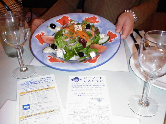メニューを見ながら好みのシーフードを頼んでみたが、けっこう料理はおいしかった。しかも魚の種類も量もかなりの量出てきて食べきれないほどの量が食卓に乗った。 私はイセエビとサーモンなどの注文をした。 食べきれないほどの量が出てきたがそれでも1人当たり3,000円の止まりで済んでいた。 1人当たり3,000円も料理を頼むととても来ても食べきれないほどの料理がテーブルの上に山積に重ねられるのである。 とみのさんも盛んにおいしいおいしいと言って腹いっぱいシーフード料理を食べていた。 オークランドではぜひともお勧めの店のひとつである。 JCBのパンフレットを持っていくと10%の割引料金で対応をしてくれるということであった。 写真に示されているのは富野さんが頼んだサラダ料理である。この夕食のあとは8時から開演されるスカイシアターでのミュージックシアターを見に行くことになっていた。 そういえば富野さんは大学生時代に音楽学校に行っているので非常に音楽については詳しく興味があるようであった。 ニュージーランドの音楽がどのようなものであるかも初めて聞きに行くことになるので興味津々であった。 少し夕食が早く終わったのでスカイシアターに到着したときには開演まで少しまだ時間であった。 |