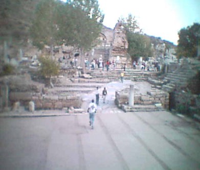 ケルスス 図書館建物内部ー エフェスEphesus都市遺跡ー図書館建物の内部ホールの壁に溝が彫られており, その溝に説明板が張られて説明がされていたが、昔はこの壁に蔵書が埋め込まれていたということであった。 この図書館の建物を外に向かって出ようとすると、ちょうどその図書館前のホールの向こうがわきに娼婦の館が見えていた。大理石の通りに続く、ここからヘラクレスの門までの通りをクレステの通りという。 この娼婦の館は2階建ての中庭式の建物であったらしい。内部には水浴びようのプールや壁にはフレスコ画などが描かれており、床のモザイク舗装も残っていた。 1階はお客さんの部屋で、女性たちの個室が二階になっていたようである。 この娼婦の館の隣に建物の中に入っていくと公衆トイレが並んでいた。簡単な構造であったが、今でいる水洗式のトイレであった。水洗用の水は隣のお風呂から流れていたらしい。 お風呂の排水が水洗用の水となって流れる仕組みの構造になっていた。また手を洗うために座ってたところの前のところに綺麗な水が流れる水路が作られていた。 |