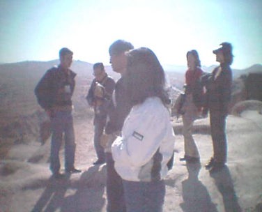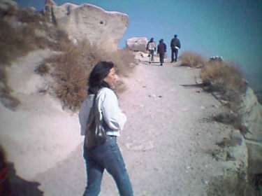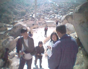 天に向かってそびえ立つ岩山中央の砦オルタヒサルが 目の前に出てきた。 次に案内された場所は、ユルギャップとネベシェルヒルの間にあるオルタヒサルというところであった。 小さな村みたいな住居が集積しているところを進んでいくと、突然前方に地上から、天に向かってそびえ立つ岩山が目の前に出てきた。 名前は中央の砦という名前がつけているという説明であった。 ガイドの説明ではこの岩山が全部くり抜かれており、内部に無数の部屋がありますという説明であった。入り口があり、そこで入場料を取られた。中に入るとたくさんの土産物が洞穴の中で売られていた。土産物店を通り過ぎていくと、道が上に続いている。階段を上りながら部屋の中を通っていくと、やがて教会がでできた。 やがて道は穴の中から外に出てこの岩山の外側を回りながら頂上に道が続いていた。 この岩山の頂上まで登っていくようである。上にいくにつれて回りの景色が素晴らしい景観が広がってきた。 ガイドの説明によるとこの岩山は昔はとりでであったということであったが、いたるところこのあたりはこのように洞くつを掘ってそれが住居となっていたその典型的なひとつの例として私たちを案内してくれたらしい |