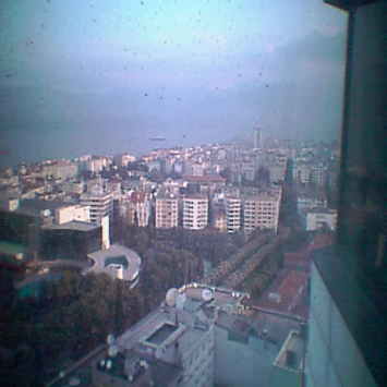 イズミルの湾内を一望する大パノラマが窓ガラスの向こうに展開 もちろんこのホテルにはフィットネスセンターやプールそしてスカッシュボール、ボーリング施設など5つ星ホテルにふさわしい施設が完備されていたが充分それを生かしきれていない運営がされているように思われた。 隣の大野さんの部屋にもおそらくエキストラベットは入ってないと思われたのでフロントに電話するように連絡をしておいた。 1時間ぐらいたってやっと3人目のエキストラベットは用意されたのでこれに横になるといつのまにか寝込んでいた。 |