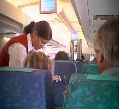 1時間20分の間に食事サービスで休みない搭乗員 |