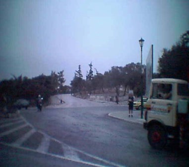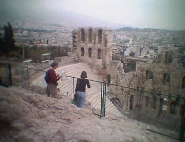2/3ぐらい登ったところで、最初に見えてきたヘロディス・アティクスの音楽堂これが1番はっきりした間違えのない道を私たちに示してくれた。何人かのアテネの人に道路を訪ねながら裏道を右左にカーブしながらアクロポリスの玄関方向になんとかたどり着くことができた 。確かにこのような道のリを辿なければ入り口につくことができないということは、簡単に地図だけ見ていたのでは難しかったあろう。 とにかく観光地?としては、道路標識が非常に不十分なのである。 そして中心市街地は、いたるところ一方通行のために、この道路標識があまりないのと手伝って果たしてこれで2,004年のオリンピック誘致ができるのかと、はなはだ心配であった。 おおよそ世界的な観光地の割合には、道路標識は非常に不十分な状態であった。 駐車場をはじめ心配していたが、アクロポリスの入り口近くには無料の公共の駐車場があった。 この無料の公共の駐車場に車を2台とも入れて、いよいよアクロポリスの丘の観光をしに行くことになった。 |