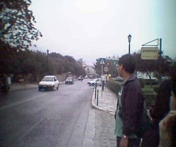いよいよアクロポリスの丘の入り口からのぼり始める最初片道3車線から4車線もある広い道路であったのが、中間辺りまでくるとすでに、道路は片道1車線まで狭くなっていた。 これで本当にアテネの中心街まで到着するのであろうかと、はなはだ心細い感じであった。 対抗車線も車の渋滞が続いており、われわれが走っている車の車線もずっと車は列をなして続いていた。 従って路線変更などは思いもつかないような状況であった。 そのような車の渋滞が起こっている中で、とにかくオートバイだけがわきを縫ってスイスイとサーフィンをしていく、まことに危なかしい限りであった。 ところがこの2車線の道路網も、しだいしだいに車線が狭くなって履行するのも難しいような幅になってきた。 それにつれて商店街みたいなところに出てきた。 大丈夫なんかなぁ、と思いながらも、いよいよ方法はないので車を走らせていた。 |