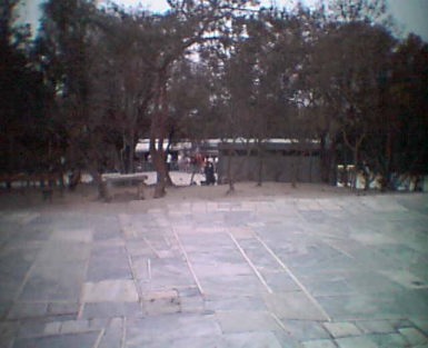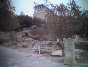 現在でも7月から8月にかけてアテネの音楽フェスティバルがここで行われている駐車場にはすでにかなりの車が止まっており、幸いわれわれの2台の車のスペースもあった。 車の中に荷物を残していると、窓ガラスを割られる事故のもとになるので、みんなに荷物は車の中には一切残さないようにといって注意を促した。 レンターカーの契約では、最低保証料金というのがあって、窓ガラスが割れても、最初の50,000円まではわれわれが負担をしなければならない。 いくら保険に入っても、この最低保証料金については借りている人間が支払わなければならない責務になっていた。 このためこれ以降、車を泊めるたびに、みんなに荷物を車の中に残さないようにと注意することになった。 時計を見ると午後の2時ごろをすでに回っていた。アクロポリスヘいく道は駐車場の道路を隔てた反対がわきにあり、ここは車の交通が激しく、この道路を渡るのに苦労した。 一見公園の出入り口のようなところがアクロポリスの丘への入り口になっていた |