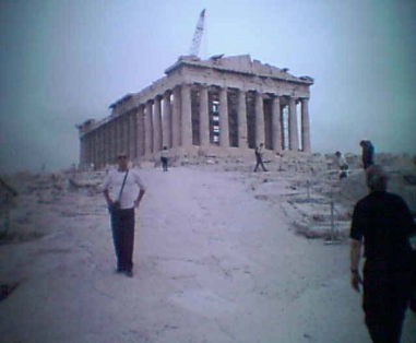 歴史の教科書に何度となく写真や話で紹介されていたパルテノン神殿小学校から、歴史の教科書に何度となく写真や話で紹介されていた建物で、今目の前にその姿を拝むことができた。 誠に感無量の感じであった。 パルテノン神殿までは大理石の石畳の道が続いていた。 ただその道もはるかかなたな歴史の重みの中に真ん中はすり減って凹んでいた。 頂上にもたくさんな観光客が既に観光に訪れていた。 やはりこの頂上まで登ってくると、なんと言っても目につくのはこのパルテノン神殿である。 ちょうどこのアクロポリスの丘はアテネの市街のちょうど真ん中、中央に位置する場所にこの丘がたたずんでいた。 従ってこのアクロポリスの丘からはアテネの市街が一望のもとに見渡せることになっている。 この建物を作った、すなわちパルテノン神殿を作った時の統治者であるペリクレスはこのことを意識して、アテネ市民がアクロポリスの丘の神殿を眺めるような形を意識して、この建物を有名な真ん中が膨らみを持つ見事なエンタシス設計を成し遂げたものである。 |