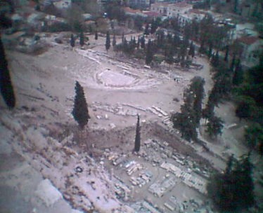 アクロポリスのすぐ下にディオニソス劇場やペリクレスの音楽堂が遺跡跡として眼下に見えていた。 |