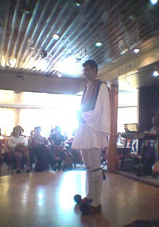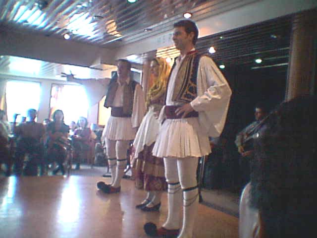 ギリシャの民族衣装第2番目のイドラ島の帰港時間も1時間ぐらいですぐ出発することになった。 船がイドラ島を出発するとすぐにギリシャ民族舞踊が始まった。 今度は今まで見ていない人を対象に船内マイクの放送があり、見ている人の入れ替えがあったが、私たちは船の中で過ごすこともないのでこの民族舞踊 を見ることにした。 写真の男性と女性が着ているのがギリシャの民族衣装である。 この衣装を見ればわかる通り、男性は白をベースにしたスカートが基調である。 そして、この男性がはいている靴は木製の靴である。 女性のギリシャ民族衣装は、頭にスカーフ、そしてカラフルなロングスカートの上にはエプロンをしている。 この民族舞踊が第3番目の寄港地につくまで延々と続いたことである。非常にサービス精神がおう盛で、ショーの演目もいろいろ工夫を凝らして前回にしたこととは違ったような演目を入れるようにしてお客さまを退屈させないようにしていた。この3名の踊り子がとにかく朝からこの後第3番目の寄港地を出発してアテネの港に着くまで夜も遅くまで延々とこのようなショーを続けてお客さまを楽しませていたことである。これがひとつのクルージングのお客さまを退屈にさせないポイントのひとつであった。このため踊り子の額からは滝のような汗がタラタラと流れていたのが非常にE印象的であった。 |