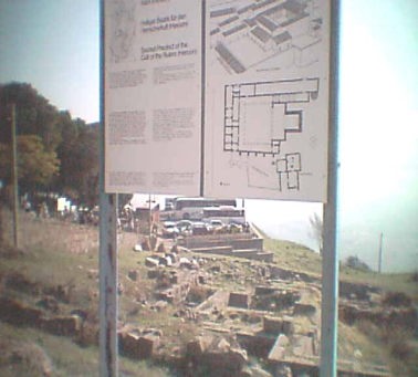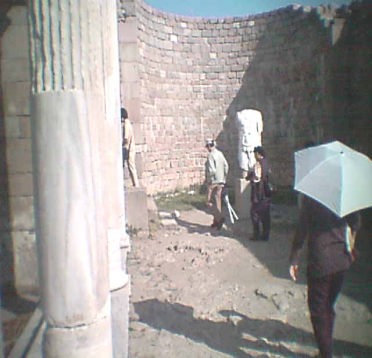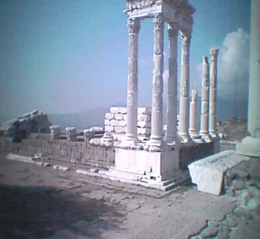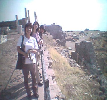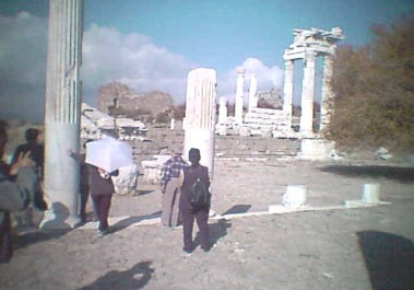 トラヤヌス神殿での記念写真この劇場は約10,000人の観客が収容でき、しかも、急こう配の斜面に作られているのが特色である。 この斜面に80段の階段状の観客席が設けられていた。 上段は安山岩の階段で、貴賓席になる下段は大理石の階段から構成されていた。 これだけの演劇場で芝居などが催されていたということであろう。当時の繁栄がしのばれる思いがする。 さらにこのベルガモの遺跡での最大の見ものは、ヘレニズム時代の彫刻芸術の最高傑作ともいわれている神々と巨人たちの戦いの浮き彫りの像である。 これはゼウス祭壇に彫られていた浮き彫りである。 一方ベルガモはまたこの時代の世界最大ともいえる総合医療センター都市でもあった。 この遺跡がアスクレピオンといわれるもので、この小高い丘陵地を下りきったところにある遺跡である。 日本でいう長期温泉保養センターといった施設に該当するものであろう。 宿泊をしながら入浴をして体を清めながら健康回復するもので合わせて音楽療法や信仰なども取り入れられていたようである。 |