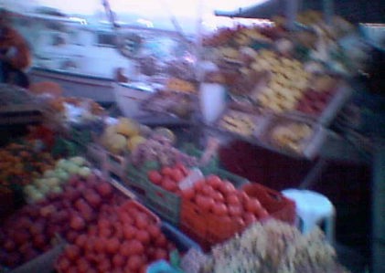 ![]() エギナ島の港の1角に道路に面して並ぶ露天のくだもの店 |