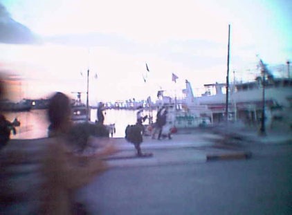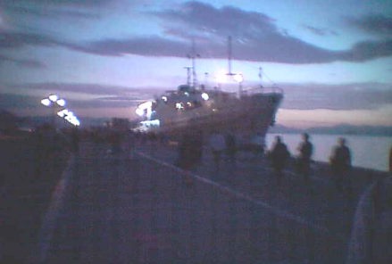 パレオ・ファリロ港帰港この女性はギリシャのアテネに住んでいる人らしかった。 いわゆる旅行会社の現地の添乗員である。 このように海外に出ると、日本の女性が1人前の仕事をして活躍しているのを 見ると大変嬉しい限りである。 このような話をしているうちに船はアテネの港に到着したようである。 船内マイクで案内があり、皆さんが乗ってきたバスが港で待っているのでバスに 乗ってアテネの街まで帰ってくれということであった。 言われても困ってしまう。 私は乗ってきたバスがどういうバスであったか全く覚えていなかった。 これだけのクルージング乗客なので相当なバス台数が待っているはずである。 この中から探すのはまず不可能であった。 船が港に接岸すると、港にはずらりとバスの行列ができていた。 しかも行列ができているバスのところには街頭電気がついていなくて、バスの中の 電灯の明かりしか明るくなく、外は真っ暗な中で、この自分たちが乗ってきた バスを探す乗客の列が延々と続いていた。 私も船を降りてこの行列の中でバスを探して歩き始めたが、やはり予想通り 自分が乗ってきたバスは全く皆目見当がつかなかった。 西田さんと一緒に歩いていたが同じように全く分からない様子であった。 |