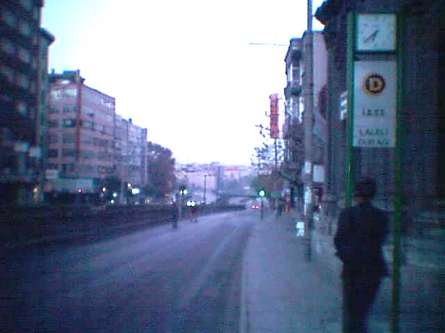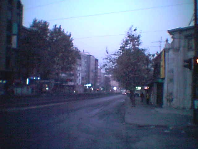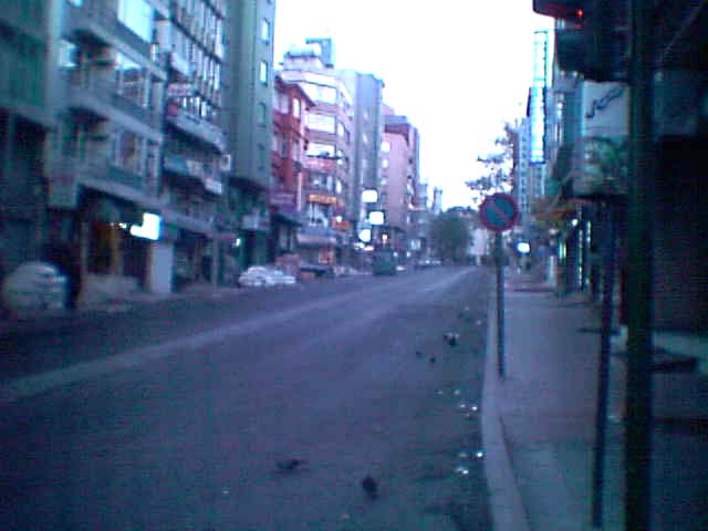 市内電車が朝早くから走ってきた前方の向こうの方角から音が聞こえてきたので、目を転じると、電車が赤々とライトをつけて走ってきた。ほとんど乗客が乗っていない市内電車が朝早くから走ってきたわけである。イスタンブールの朝の6時台はほとんど人が踏ていなかった。 道路の真ん中には市内電車が通る線路が・・・・・列車が走っていない線路がどこまでも続いていた。 次第に朝日が当ててきて、空の方は今日も快晴であるというふうなカラリとした天気を想像させるようなさわやかな色を呈し始めていた。 地上の方は太陽の光線がまだ届いていなくて、建物の黒い姿が道路沿いに並んでいるのが印象的であった。 向こうの方からライトの明かりが線路の上ですると思っていたら、市内電車が早朝を線路上をこっち向いて走ってきた。 早朝1時間ほど歩いていたのに、電車を見たのはこれ1台限りであった。 トルコ人は朝が非常に遅いようである。 ギリシャのアテネでは、朝の6時にはもうラッシュアワーの状態のように朝が早かったが、これとは対照的にトルコではほとんどまだ床について眠っているような状況であった。 この左の写真に写っている通りは最もイスタンブールのはなやかなメーン通りであり、それがこのようにほとんど無人の状態を呈しているような状況であった。 建物はあまり背が高い建物はなく、だいたい5階建て止まりであった。 一階にはほとんど店舗が入っており、いろいろな各種店がこの道路沿いに並んでいた。 日中になるとこの通りが人でごった返すというそのような通りであった。 |