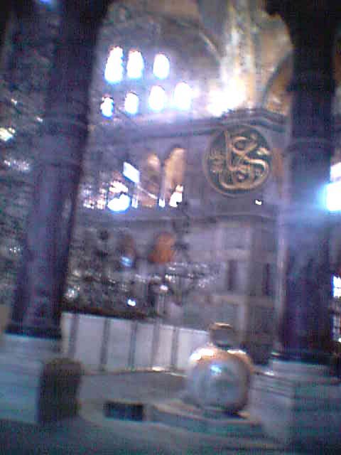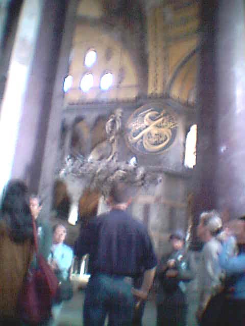 われわれ1行が英語ガイドさんの後について説明を聞いているとわれわれの1行のあとから日本人グループが日本語ガイドを伴って入ってきた。これ幸いと思ったので説明はそちらのガイドさんの後につき従って聞くことにした。 だいたいどの1行も20人から30人ぐらいを伴っており、それが1つの集団となって説明をあちらこちらで聞いていた。 われわれがこの寺院中に入った時は、ちょうど修理中のようであった。 50メートルにもおよぶ足場が築かれて、この巨大な天井に届くかと思われるような足場の上で修復の作業が行われていた。 ユスティニアウス帝によって建設されたこの寺院は高さが地上54M 巨大のドームを備えており、中に入ると空洞の中で、地上54メートルの巨大ドームを仰ぎみることになる。この巨大ドームがまさに、天上の神の国を再現している。 南北約33M、東西約31Mの巨大な楕円形のドーム天井にモザイクが惜しみなくかかれている。 壁1面にモザイクが惜しみなく施されていた。 モザイクの背景は全て黄金の金色であった。 さすがに建設したユスティニアウス帝が過去にないそして未来にもない建物をといって作っただけのことはある、比類ないそして豪華な巨大な建物であった。 このアヤソフィア寺院には、ビザンチン美術の最高傑作のひとつとしてキリストの請願図デイシスが描かれている。 中央のキリストをはさんで左わきに聖母、右に洗礼者ヨハネを配置したモザイクで、残念ながら画面の3分の2は失われてしまっているが非常に残された画面はしっかりした絵で描かれている傑作である。 |