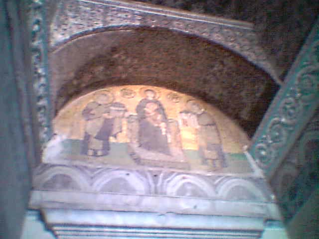 聖母にこのアヤソフィアや寺院をささげるユスティニアウス帝と、そしてコンスタンチノープルをささげるコンスタンチヌス帝の絵が描かれているこの建物の南側の入り口の扉の上には聖母にこのアヤソフィアや寺院をささげるユスティニアウス帝と、そしてコンスタンチノープルをささげるコンスタンチヌス帝の絵が描かれているものがある。 この東ローマ帝国の首都コンスタンチノープルと当時国教であったキリスト教すなわちギリシャ正教の大本山でもあったこの東ローマ帝国の首都コンスタンチノープルの歴史を物語るものとして非常に興味深い構図である。 このほかのモザイク画として、回廊の南側の東端にあるモザイクに、東ローマ帝国の皇帝とこの皇后がキリストから祝福を与えられている構図がある。 これなどは典型的な東ローマ帝国のキリスト教が国教となったその位置関係を表すものとして非常に興味深い構図である。 中心にキリストを置いているもの以外にも、中心に聖母子を置いて、両側に皇帝と皇后を配置した構図も随所にモザイクが見られる。 皇帝の門から入ったところのすぐ天井部分には美しいモザイクの絵として聖母子像が描かれている。 これは非常に鮮やかな美しいモザイク画として現在にも残っている。 |