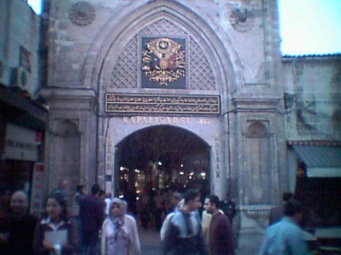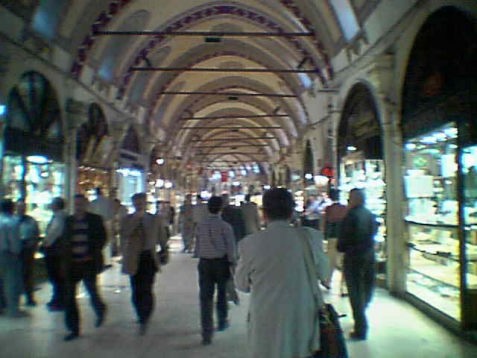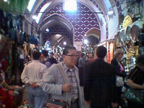 いかにも歴史を経た建物であった。 正面入り口の入場口のちょうど上にイスラム語で言葉が書かれていたが、その上には大きな文章がどっかりと腰を据えて金色色の輝きを周囲に放っていた。 この入り口の門を一歩中に入ると通りの両側には店舗がずらりと並び、それぞれの店舗で自分ところの品物をセールス活動をしているのが非常ににぎやかな喧噪となって伝わってきた。 西田さんは入れ物の皮の袋を、このグランドバザールで買い求めたいと言って盛んに店を物色していた。 ガイドの説明によると、このバザールはすでにビザンチン時代からここに市場があったということである。 本格的に整備されたの西暦1,461年オスマントルコのメフメット2世が安全な広域ができる市場をということでここに本格的な市場を整備充実していったものであるということであった。 このバザールの国内面積は約30平方キロメートル店舗の数は3,300件に上るということであった。 ここで店舗で商われてる商品も非常に数が多く、カーペットから始まり骨とう品、衣類、革製品、貴金属、陶器、銅細工、カーペット、レストラン、郵便局などなど。 訪れる人は外国人の観光客から始まって地方のおのぼりさんまでたくさんの人が訪れている。 |