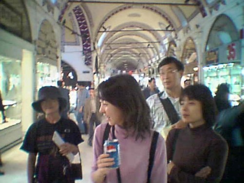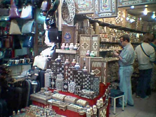 写真に見る通り狭い店の中を所狭しとありとあらゆる品物が展示販売されていた。このグランドバザールの1角はショッピング好きな人には答えられない魅力的な場所であろうと思われた。 写真に見る通り狭い店の中を所狭しとありとあらゆる品物が展示販売されていた。 店の種類も多く西田さんもやっと目的の皮の袋を買い求めることができた。 どの店も客の呼び込みに非常に熱心であった。 豊富で展示している店の品物の種類は非常に豊富でしかも多彩な内容になっていた。 日本ではあまり見られないような工芸品の数々が展示されており,見るだけで興味をそそられる土産物がずらりと店の前に展示販売されていた。 西田さんは盛んに物を運ぶための皮の袋の製品を購入したいと言って店の中にい次々と入って物色をしていた。あまりにもお土産を買いすぎたために袋が必要になったためである。 写真にも見られる通り非常に工芸品のデザインは、トルコ独特のものがあって、日本では異常に新鮮な感覚で受け止めることができる内容となっていた。 このグランドバザールではトルコ国内では珍しく英語が通じる空間であった。 このグランドバザールは夜の7時には門が閉められるということであった。 |
