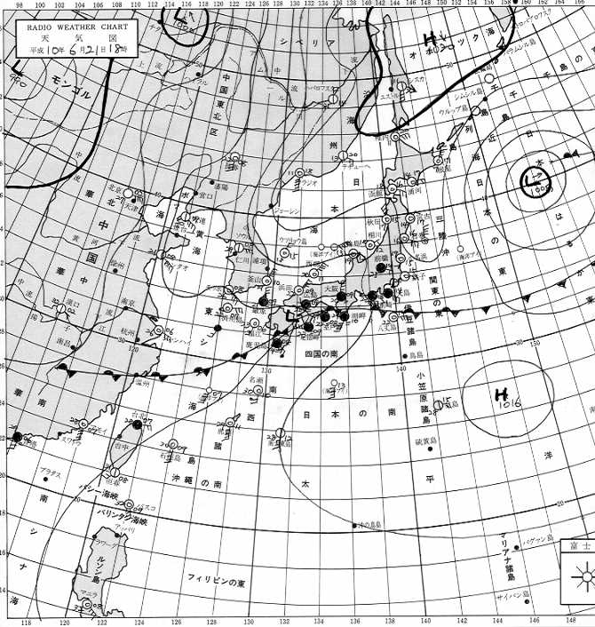 父島付近の太平洋高気圧から、湿った暖かい南風。北のオホーツク海高気圧から冷たい北風