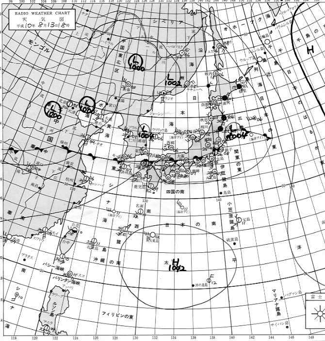 8月になっても、太平洋高気圧が日本東方に勢力が大きくなり、南方・沖縄方面は弱く。オホーツク海高気圧も勢力が衰えず。