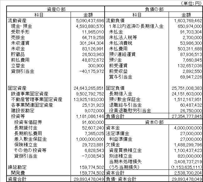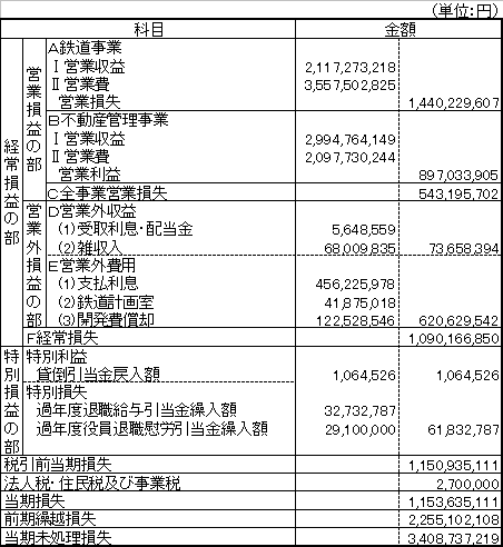 損益計算書を見ると、1999年度の鉄道事業の収支は、収入21億1727万円に対し、費用が35億5750万円、差し引き14億4023万円の赤字になっています。前年度に比べて収支は若干改善されましたが、それでも収入が費用の60%に満たない状況です。。