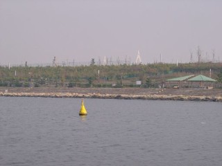 丘に見える白いパイプはメタンガス抜きのもの。舞洲は過去にごみを埋め立ててできた島であるが、当時は今より処理が完全でなく可燃ごみを一部焼却せずに埋めていたため、メタンガスの発生が止まらない。 | |