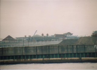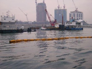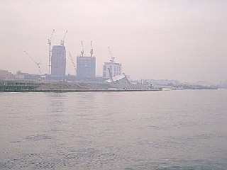 ユニバーサル・スタジオ・ジャパン(USJ)は建設中。この地中には大量の有害な産業廃棄物が埋まっている。右はUSJの港だが大阪市が建設している。