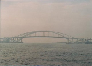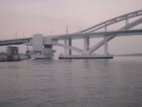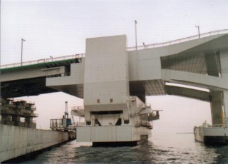 664億4000万円をかけて造られた夢洲−舞洲連絡橋。なんとこの橋脚は水に浮いていて、タグボートで押して航路を開けることができる浮体可動橋。